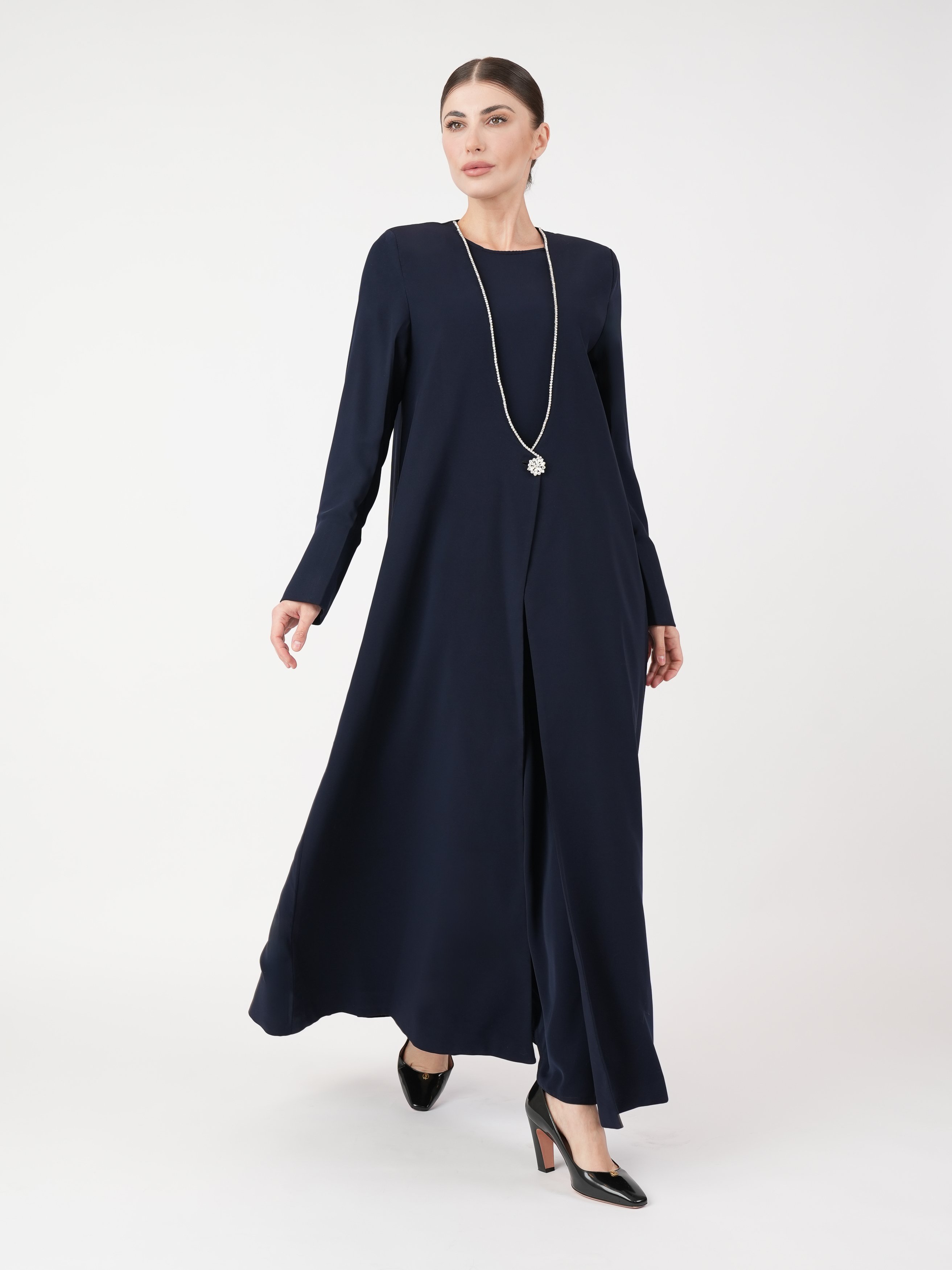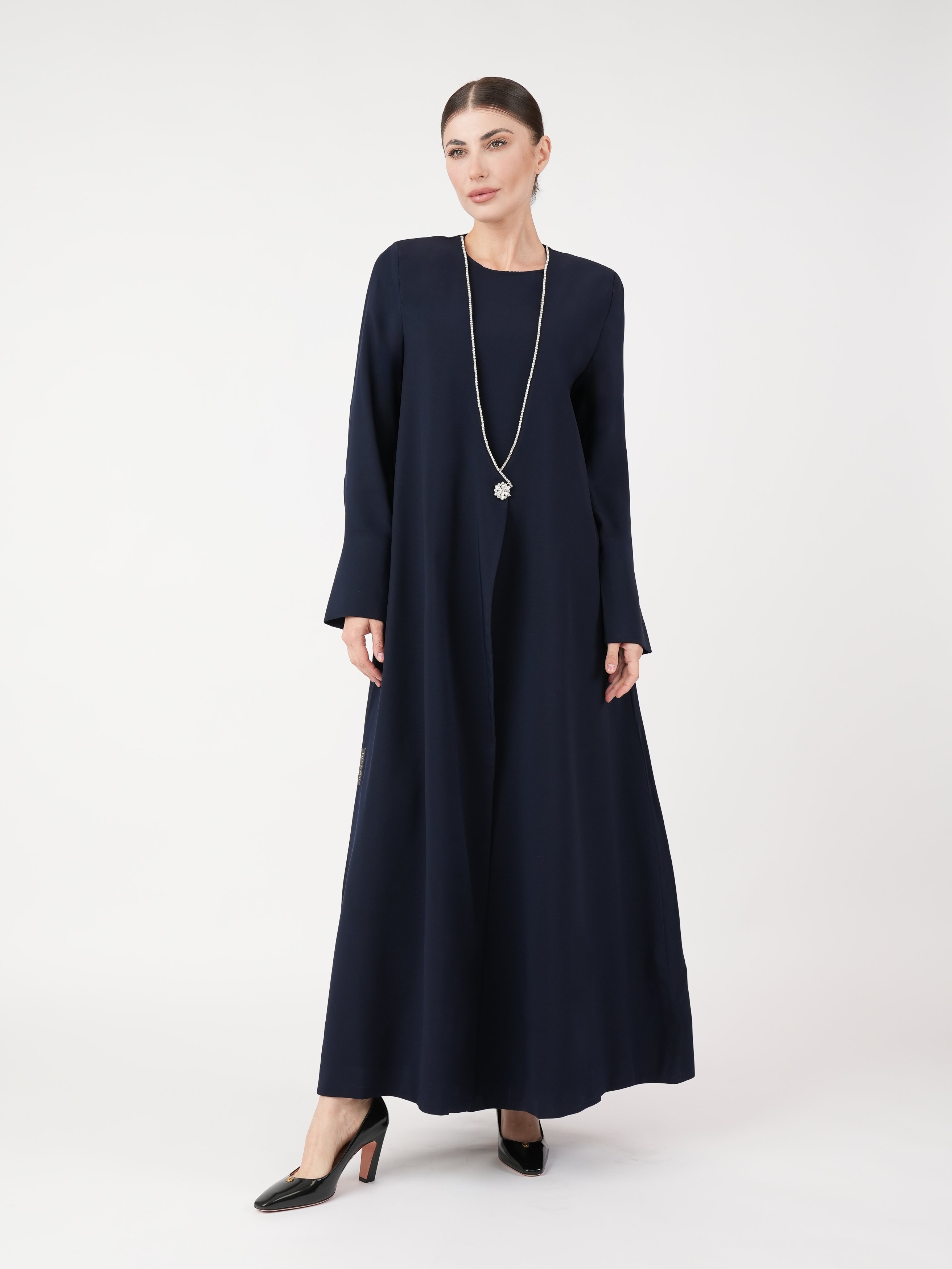 عباءة بليزر من الكريب الفاخر بلون كحلي عميق ،تجمع بين الأناقة العصرية والكلاسيكية الخالدة لتمنحك حضورًا أنيقًا في العمل والمناسبات الراقية.
